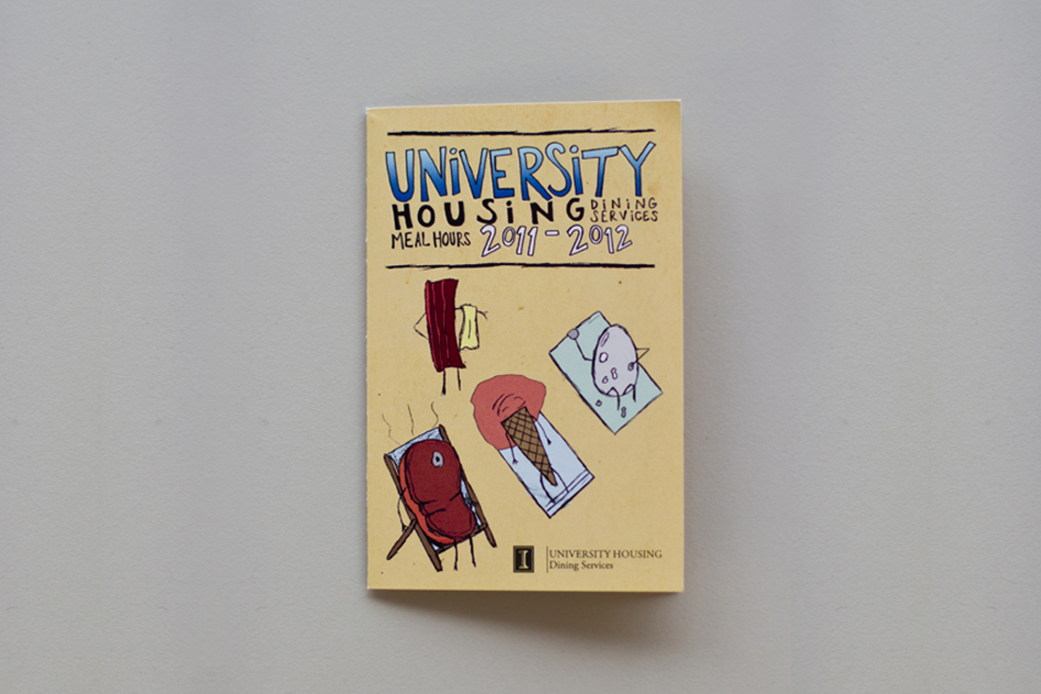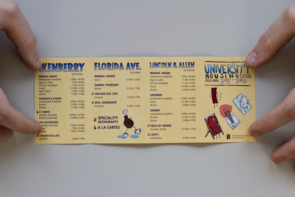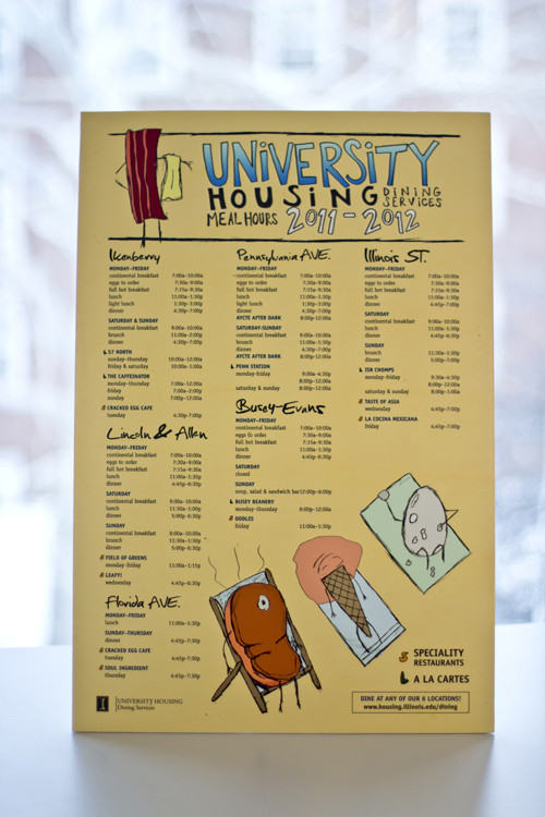 Designed a mini campaign advertising dining hours, locations and features, with original illustrations and handwritten titles. Typeset large bodies of text on a 20ˣ15" board, a pocket brochure, and three versions of 11ˣ17" posters. All of the University of Illinois Dining Halls displayed this informational poster.